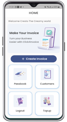 After login you can find Home page where you can see multiple options like Create Invoice, Passbook, Customers, Topup and Logout option.