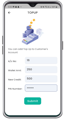Here is our Topup screen by which you can Add topup to your Customer’s account.You will need to add their account no, new Wallet amount which will basically the topup amount and you can set new credit limit as well and your PIN number (your password to login) to Add topup.